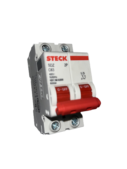 Interruptores termomagnéticos trifásicos para BT. La tensión de servicio es de 400V y la tensión de aislamiento es de 500V. El sistema de montaje es del tipo riel DIN, como también los hay en sistema americano NEMA. Los bornes son para cables rígidos y permiten conectar un cable de 25 mm2 hasta 25 amperes y de 35 mm2. La curva de disparo es lenta del tipo C, disparo magnético entre 5 y 10 la corriente nacional. Su utilización está definida a la protección de la instalación por sobre consumos y corto circuitos en instalaciones eléctricas. Estos pueden ser instalados en la caja de empalme y en tableros de distribución eléctrica. 2x10 AMP Curva C 10KA